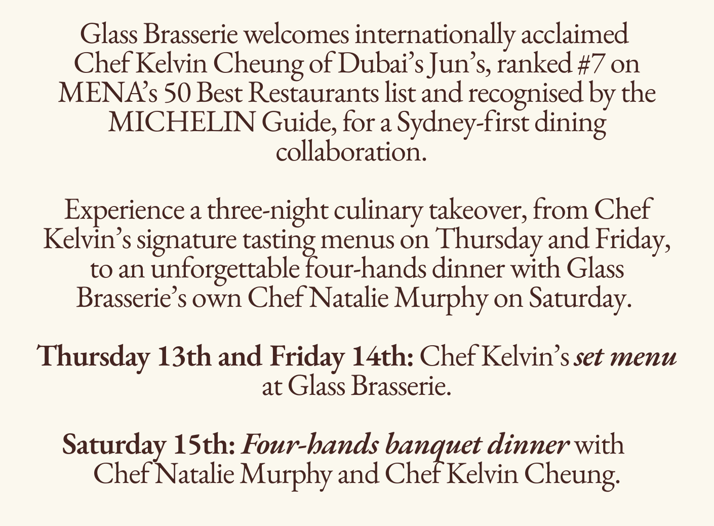 JUN’S DUBAI TAKEOVER AT GLASS BRASSERIE JUN’S DUBAI TAKEOVER AT GLASS BRASSERIE SET MENU FOUR-HANDS BANQUET